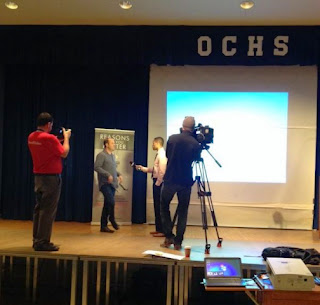 Before the students entered the auditorium, Colin Mayfield from WLKY interviewed me for the news. I hope they were only shooting me from the chest up, because from the chest down it looks like I'm trying out for Riverdance (the international Irish dancing phenomenon).